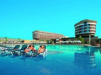 Белек,Анталия Разположение: разположен на 35 км от летището, на 40 км от центъра на г. Анталия, на 2 км от Белек, на брега на морето. Хотелът е построен през 2007 г., с обща площ от 93.500 м2. Състои се от 3 главни 6-етажни сгради и 27 дву- и триетажни къщички Main Building 1: (стаите са с частичен излед към морето) 256 standard room (от тях 2 стаи за инвалиди, макс. 3 чов., 32м2); 30 двустайни family room (2 спални с врата, макс. 4 чов, 39 m2); 26 едностайни executive room (джакузи, тераса с джакузи и шезлонги,макс. 3 чов., 37 м2) ; 2 тристайни king suite room (гостна, мини–кухня, 2 спални с врата, 2 бани, джакузи, под - паркет, тераса с джакузи, шезлонги и хамаци, макс. 4+2 чов, 110 м2); За рожден ден: предоставя се торта за 2 чов. В стаите: баня с вана (Main Building),баня с душ (Bungalow),сешоар, индивидуален климатик,плазмен телевизор,телефон, мини-бар (зарежда се ежедневно с разхладителни напитки- безпатно), сейф (в стаите, безплатно),под – мокет (main building),под– теракот (bungalow),балкон,почистване на стаите – ежедневно, смяна на спалното бельо – 2 пъти седмично,смяна на хавлиите – ежедневно На територията на хотела: основен ресторант,диетична храна,8 a la carte ресторанта (турски, китайски, рыбен, италиански, мексикански, гръцка таверна, френски — с предварителна резервация, посещението на всеки един от ресторантите по веднъж по време на престоя е безплатно, японский ресторант -срещу заплащане),12 бара (от тях Planet Bar – срещу заплащане),4 открити басейна,закрит басейн ( с подгряване на водата, работи само през зимата),5 водни пързалки , телевизинна зала,кинотеатър,SPA – център,лекарски кабинет, фризьорски салон,търговски кът,пералня,химическо чистене,rent-a-car, паркинг,4 конференни зали (за 40 - 810 чов.) Хранене: ULTRA ALL INCLUSIVE За децата: детски буфет,2 детски басейна,детска площадка,мини клуб (4-12 год.), junior club (13-16 год),лунапарк ( от 3-15 год.),детски колички (срещу заплащане),детегледачка (срещу заплащане) Развлечения и спорт: сауна,турска баня,парна баня,фитнес зала,аеробика,водна гимнастика, тенис на маса,баскетбол,плажен волейбол,мини голф,дартс,боча, бадминтон,4 тени корта с тартаново покритие — през деня уиндсърфинг (с лиценз),безмоторни водни видове спорт, анимационни програми,музика на живо (в определени дни),дискотека безжичен интернет (в лоби бара) Допълнително се заплаща: масаж,боулинг (4 пътеки),билярд,наем на ракети и топки за тенис, осветление на тенис корта,уроци по тенис,видеоигри,моторни водни видове спорт,курс по гмуркане,интернет кафе,шатри на платформите Плаж: собствен, пясък. (има 2 платформи като на една от тях ‘Adult Beach & Jetty’ не се допускат деца до 16 г.). Чадъри, шезлонги, матраци – безплатно. Плажни хавлии: безплатно. При басейна: чадъри, шезлонги, матраци – безплатно. A Block Family Land View UAI