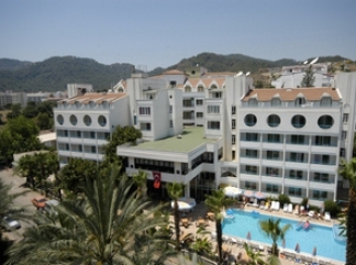 Мармарис, Турция Разположение: Хотелът е разположен на 90 км от летище Даламан, на 1 км от центъра на Мармарис, на втора линия, на 60 м през пътя от морето. Хотелът се състои от един 6-етажен корпус: 96 standard room (макс. 3 чов., 18 м2); 1 стая за инвалиди. 2 двустайни family room (2 спални с врата, макс. 3+1 чов., 36 м2). В стаите: вана, сешоар, индивидуален климатик, телевизор, телефон, мини бар (платено), сейф (в стаята, платено). На територията на хотела: основен ресторант, 3 бара snack bar, открит басейн, салон за красота, магазин, обмяна на валута, TВ зала. безжичен интернет(в лоби) Хранене: закуска, обяд и вечеря на шведска маса, доп. хранения, напитки турско производство без лимит За децата: детски басейн, детска площадка. Развлечения и спорт: Безплатно - фитнес, тенис на маса,турска вечер (1 път седмично) Допълнително се заплаща: масаж, сауна, билярд, водни видове спорт (на плажа) Плаж: градски, пясък / чакъл. Чадъри, шезлонги, дюшеци – платено. Плажни кърпи: няма. При басейна: чадъри, шезлонги– безплатно. Standard AI