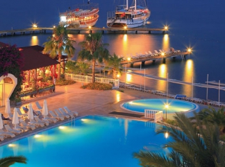 Мармарис, Турция www.marmarisresort.com Местоположение: на брега на морето, на 100 км от летището на гр. Даламан, в селището Хисароню, на 20 км от гр. Мармарис. В хотела: Хотелът се състои от една 4-етажна сграда: 284 standard room (land view: максимум настаняване 2+2 човека, sea view: максимум настаняване 2+1 човека, 26 кв м); 36 двустайни фамилни стаи (две спални с врата, максимум настаняване: 3+1 човека, 46 кв. м). Стаи: централен климатик (работи в определини часове), телевизор, телефон, мини бар (при настаняване безалкохолни напитки -безплатно), сейф (в стаята, платено). В банята вана, сешоар. Пода на стаите е мокет и керамично покритие, разполагат с балкон. Почистването на стаите става ежедневно. Спалното бельо се сменя 4 пъти седмично. Удобства: основен ресторант, 2 a la carte ресторанта (рибен и средиземноморски, с предварително записване, платено) и 7 бара, room service (24 часа, платено), 3 открити басейна, закрит басейн, 3 водни пързалки, лекарски кабинет, Wellness & SPA център, салон за красота, пране, магазини. За децата: 2 детски басейна, детска площадка, мини клуб (4–12 г), бавачка - срещу заплащане Плаж: собствен плаж от пясък, чакъл и пирс. На разположение на гостите е бар на плажа. Чадъри, шезлонги, дюшеци – безплатно. Плажни кърпи: срещу депозит. Безплатни Услуги: сауна, турска баня, фитнес, аеробика, водна гимнастика, водно колело, волейбол на плажа, тенис на маса, мини футбол, баскетбол, 4 тенис корта (изкуствено покритие, през деня), стрелба с лък, дартс, кану, анимационни програми, дискотека (вход), безжичен интернет (лоби). Платени Услуги: масаж, билярд, наем на ракети и топки за тенис, осветление на тенис корта, уроци по тенис, курс по гмуркане, уиндсърфинг, водни видове спорт, интернет кафе. Безплатен автобус до центъра на града 2 пъти дневно. Standard Land View AI